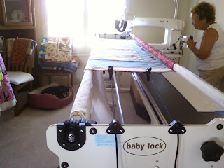 While in Florida recently, we were going through some things at my parents' house. My mother loved sewing and especially quilting. My sister found 1 finished quilt and 3 quilt tops. We divided them up and I came home with one of the quilt tops. I wanted to get it quilted, so I bought fabric for the backing and went my friend, Diana's, house to start the process. You see... Diana has a brand - new - quilting machine by Babylock.